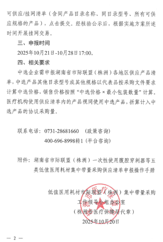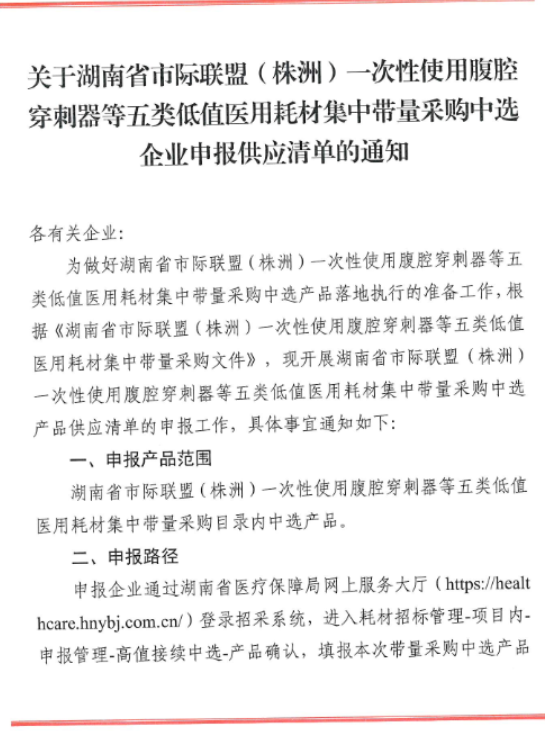 關(guān)于湖南省市際聯(lián)盟(株洲)一次性使用腹腔穿刺器等五類低值醫(yī)用耗材集中帶量采購中選企業(yè)申報供應(yīng)清單的通知