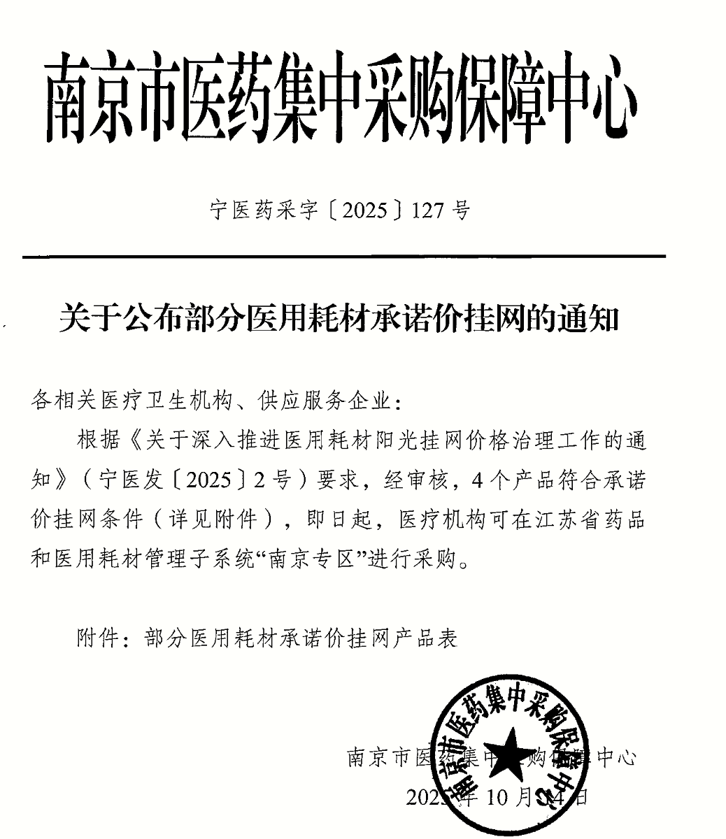根據(jù)《關(guān)于深入推進(jìn)醫(yī)用耗材陽(yáng)光掛網(wǎng)價(jià)格治理工作的通知》(寧醫(yī)發(fā)〔2025〕2號(hào))要求,經(jīng)審核,4個(gè)產(chǎn)品符合承諾價(jià)掛網(wǎng)條件(詳見附件),即日起,醫(yī)療機(jī)構(gòu)可在江蘇省藥品和醫(yī)用耗材管理子系統(tǒng)“南京專區(qū)”進(jìn)行采購(gòu)。